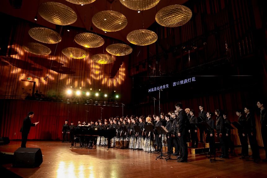 上半场以混声团带来的原创作品《一样》开场,清亮的歌声传达了对老一辈科学家的敬仰。《花树下》宁静深沉,《我爱你中国》则活泼热烈,抒发了对祖国的满腔热爱与深情歌颂。随后,CATION人声合唱团演绎了两首精彩的阿卡贝拉作品《Believer》和《乘风归去》,创意十足的和声编排和极具层次感的纯净人声带来独特的审美体验。男声团紧随其后,以一曲激昂的《The Greatest Show》将气氛推向高潮。《Beau Soir》《Ritmo》《蝶恋花》和《Wedding Qawwali》这四首极具地域特色的乐曲也依次登场。其中,《蝶恋花》改编自中国古典诗词,展现了中华传统文化的魅力。