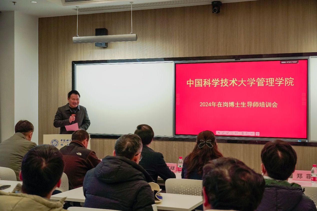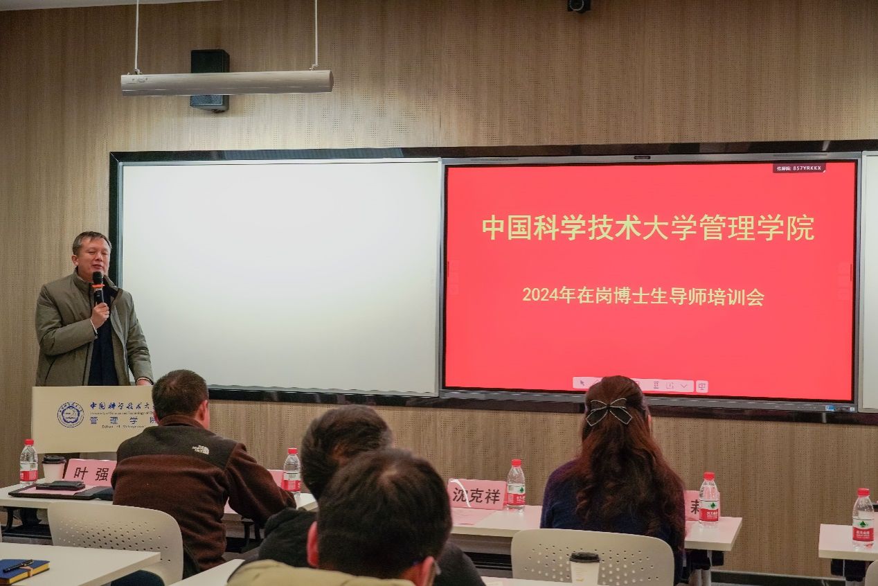 为了进一步提升博士生导师的培养能力和教育质量,12月25日,中国科学技术大学管理学院于东区管理科研楼第二案例室召开博士生导师培训工作会议。会议邀请了校心理健康教育与咨询中心主任沈克祥、校研究生院培养处处长王莉、校学科建设处处长秦进、校学位委员会办公室学位授予办公室主任郑菲、校研究生院招生处业务主管吴新龙等专家进行主题分享。管理学院党委书记古继宝教授、执行院长叶强教授、副院长吴杰教授和博士生导师出席会议。会议由吴杰主持。
