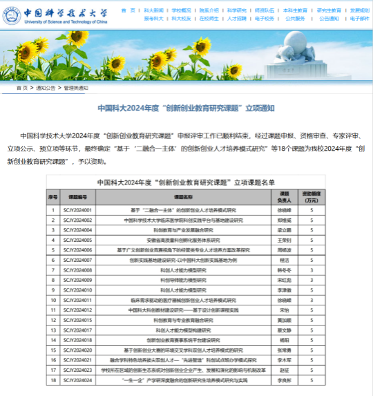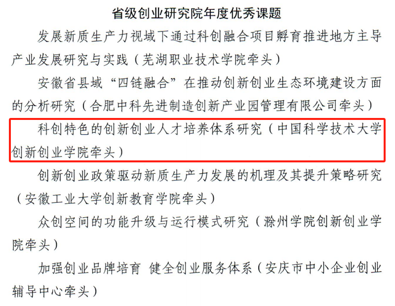 自2022年入选首批“省级创业研究院”以来,在省人社厅、教育厅、财政厅的指导下,中国科大创新创业学院积极推进创新创业相关理论研究,不仅牵头完成了《面向国际化的创业大赛研究》《科创特色的创新创业人才培养体系研究》等2项重点课题研究,还自行开展36项“创新创业教育研究课题”,以期为创业实践提供扎实的理论基础,助力安徽省创新创业教育高质量发展。