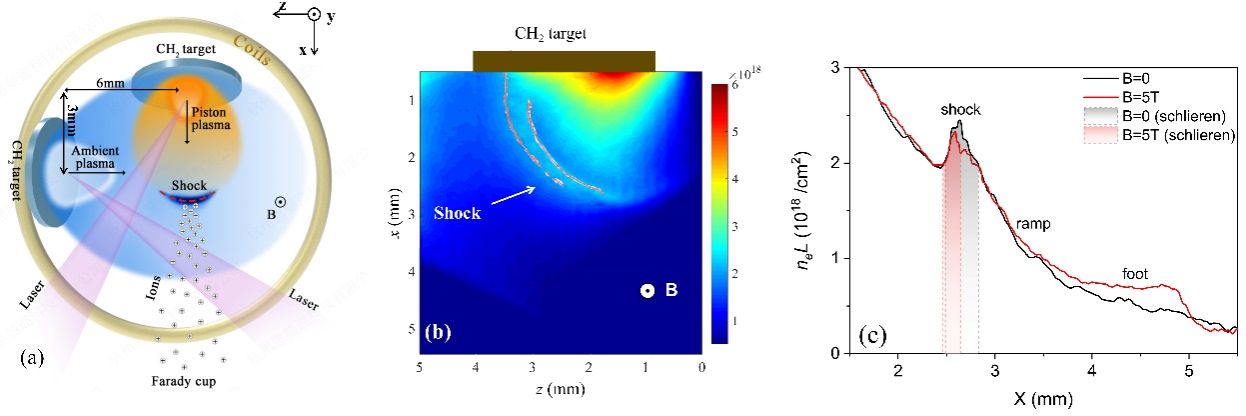 图1 神光II激光装置的磁化无碰撞冲击波离子加速实验。(a)实验布局图,(b)光学干涉和纹影方法测量的磁化无碰撞冲击波的二维结构,轮廓线是纹影测量的激波间断面、色彩是干涉测量的激波面密度分布,(c)有无磁场时测量的无碰撞冲击波一维结构,有磁场时纹影显示的激波间断面区域更窄、但加速离子形成的激波ramp和foot区的密度更高。
