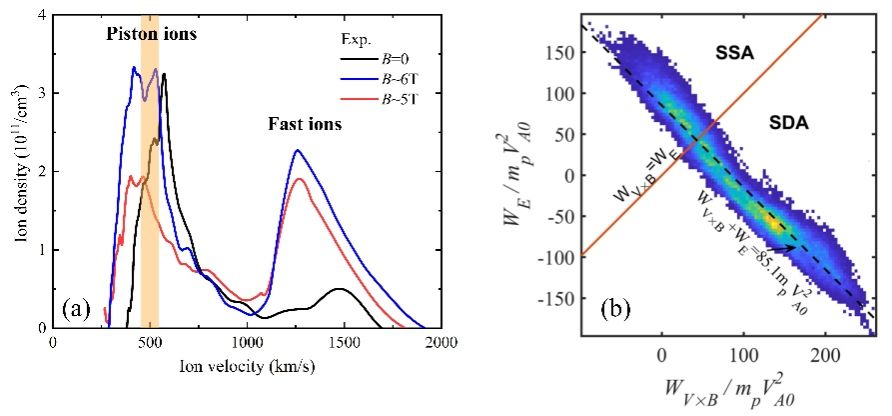 图2 (a)实验测量的离子谱,除了接近冲击波速度的活塞离子(阴影区标出了冲击波速度),也出现了2-4倍于冲击波速度的准单能快离子,(b)漂移加速(SDA)而不是冲浪加速(SSA)主导了离子加速过程。