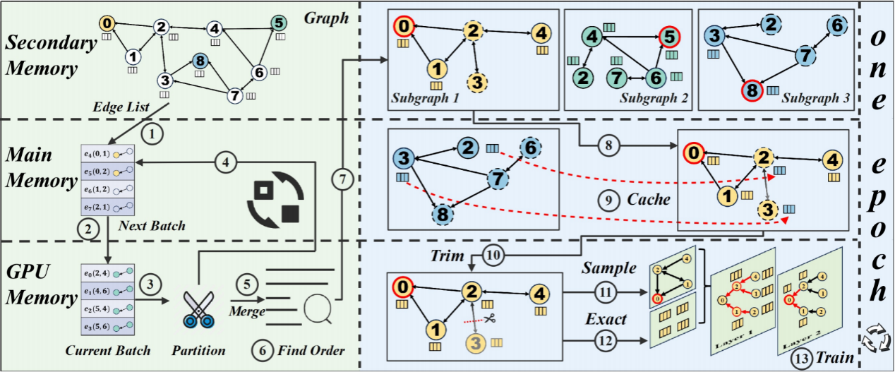 图神经网络(GNN)的主流训练框架,如DGL和PyG,利用GPU的并行处理能力从图数据中提取结构信息,在推荐系统、自然语言处理、计算化学和生物信息学等领域展现出卓越性能。尽管GPU在GNN训练中提供了强大的计算优势,但其有限的显存容量难以容纳庞大的图数据,因而现有GNN系统在大规模图数据上的扩展性方面仍面临挑战。对此,DDL实验室团队提出了一种新的核外(Out-of-Core)GNN训练框架——Capsule,为大规模图神经网络训练提供了高效的解决方案。与现有的核外GNN框架不同,该系统通过图划分和图裁剪策略将训练子图结构及其特征完全放入GPU显存之中从而消除了反向传播过程中CPU与GPU之间的I/O开销,进而显著提升了系统性能。此外,Capsule通过设计基于最短哈密顿回路的子图加载方式和流水线并行策略,进一步优化了性能。同时,Capsule具备即插即用的特性,能够无缝集成至主流开源GNN训练框架中。在大规模真实图数据集上,Capsule与现有最好的系统相比能够在仅使用22.24%的内存下带来最高12.02倍的性能提升,并提供了关于训练所得嵌入方差的理论上界。