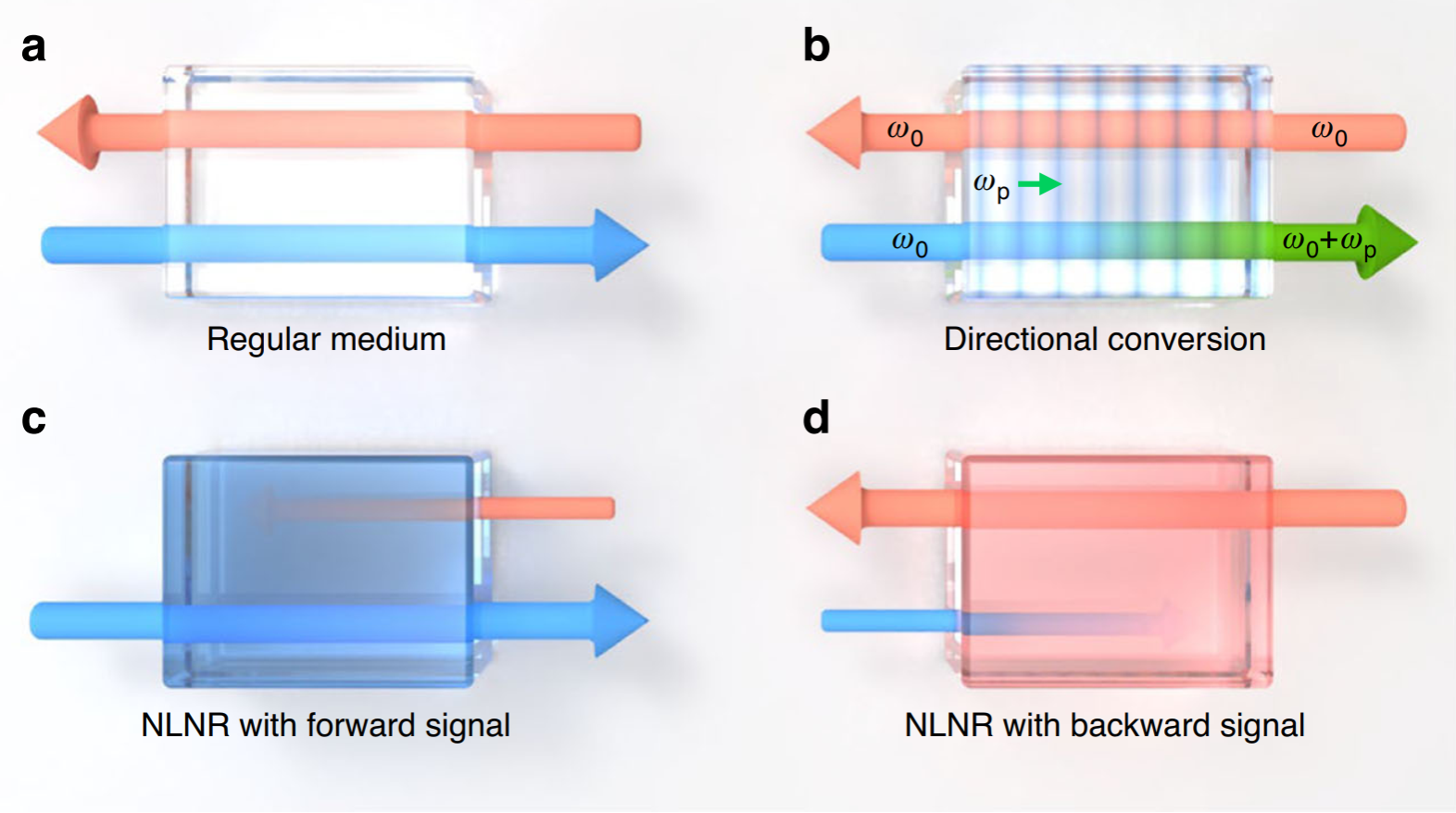 类比于光学介质折射率的非线性响应,非线性非互易指的是介质的非互易性与施加在介质上的光场强度相关。自诱导非互易是非线性非互易的一种特殊形式:较强的正向信号光在传播过程中改变介质特性,使其仅允许正向光通过而阻挡反向光。如图1所示,区别于互易介质(图1a)和非线性频率转换介质(图1b),非线性非互易介质(图1c、d)无需额外功率输入即可实现方向可重构的光学非互易。
