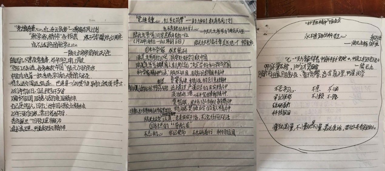 学工部处、人武部党支部青年党员、专职辅导员孟颖进行了题为“永不迷路的科学之心——陆元九爷爷的航天人生”的主题宣讲,讲述了“七一勋章”获得者、中国科学院院士、中国工程院院士、我国自动化技术开拓者之一陆元九老先生“学好科学救中国”,将志业与国运相连的感人事迹。通过陆元九院士的人生决策、研究品格、工作态度、一生为国的奉献精神等,生动阐释了科学家精神的内涵。同学们认真聆听,用稚嫩的笔迹记录下了他们对科学家精神的理解。