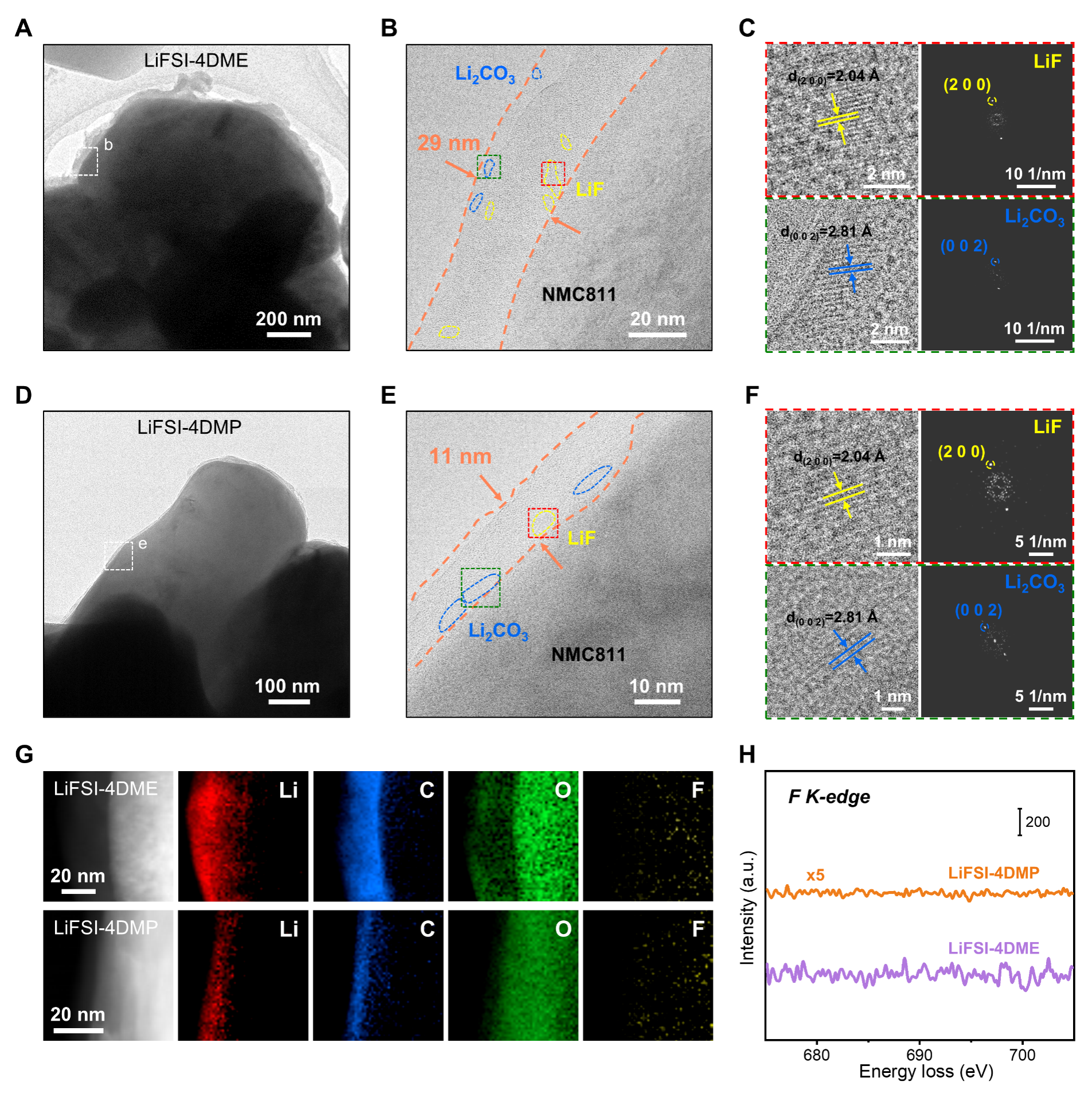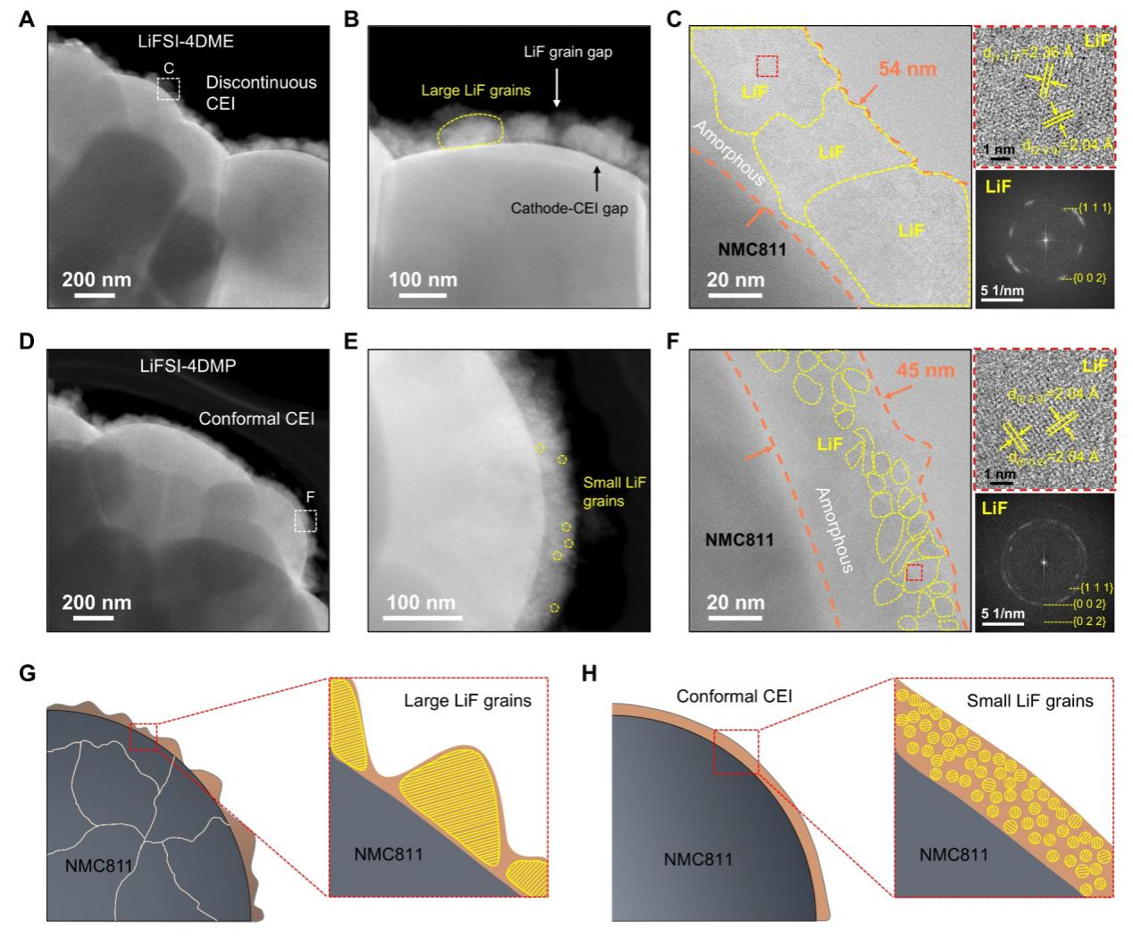接着对长循环后的CEI的组成和结构进行了表征,以探究CEI在循环过程中的演变过程。结果表明,经过200次循环后,由溶剂衍生的CEI逐渐演变为阴离子衍生的CEI,主要由FSI-分解生成的结晶性和非晶态的LiF构成。在此阶段,嵌入在CEI中的LiF纳米晶体的尺寸和形貌决定了CEI结构和界面特征。在DME基电解液中,大的LiF晶体颗粒堆积导致了孤立的、不连续的CEI结构的形成,无法对高压正极表面进行有效的钝化。而在DMP基电解液中,CEI中生长的LiF纳米晶体尺寸更小,且分布均匀,从而形成致密且共形的镶嵌结构CEI。这种共形CEI可以显著抑制低浓度醚电解液的氧化分解并提高其高压稳定性。
