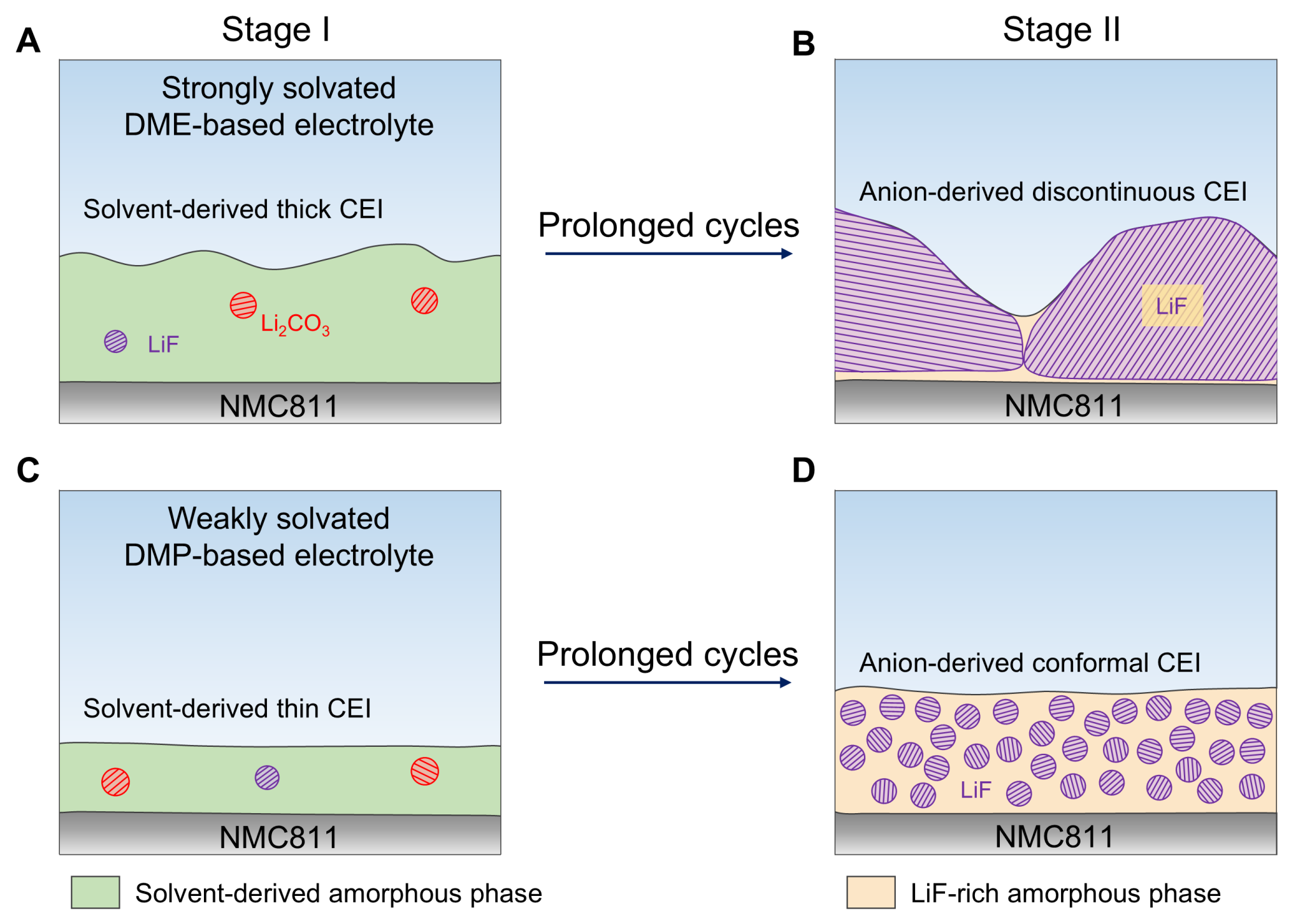 本研究基于双氟磺酰基酰亚胺锂盐(LiFSI)和两种结构相似的醚溶剂(强溶剂化的DME和弱溶剂化的1,2-二甲氧基丙烷(DMP))组成的模型电解液体系(LiFSI-4DME 和 LiFSI-4DMP),来揭示高压LiNi0.8Mn0.1Co0.1O2(NMC811) 正极上CEI的形成和动态演变过程。通过cryo-EM发现,在循环初期(20圈),LiFSI-4DME和LiFSI-4DMP电解液中的初始CEI呈现出马赛克结构,极少量的无机纳米晶体分散在非晶态基质中,组分以有机物和含碳无机物为主,因此称为溶剂衍生CEI。