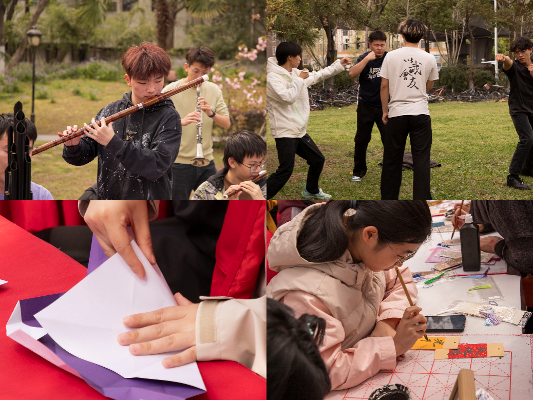 开幕式表演结束后,师生们漫步樱花大道,在盛放的樱花树下感受着各社团同学的热情。各学生社团纷纷结合自身特色,带来丰富多彩的传统文化体验:校学生民族乐团的成员们手把手教大家弹奏传统乐器,悠扬的丝竹之声不绝于耳;校学生武术协会的同学们腾挪闪转,刚劲有力的招式引得阵阵喝彩;校学生围棋协会的"高手对弈"吸引众多爱好者驻足观摩,棋盘上黑白交错间尽显智慧;校学生折纸协会的成员们耐心指导,一张张彩纸在巧手中变幻出各种造型。校学生历史文化协会的汉服展示让师生们亲身感受宽袍大袖的古韵,校学生双馨书画协会的书法体验则让人人都有机会提笔挥毫,在墨香中体会书法艺术的独特魅力。