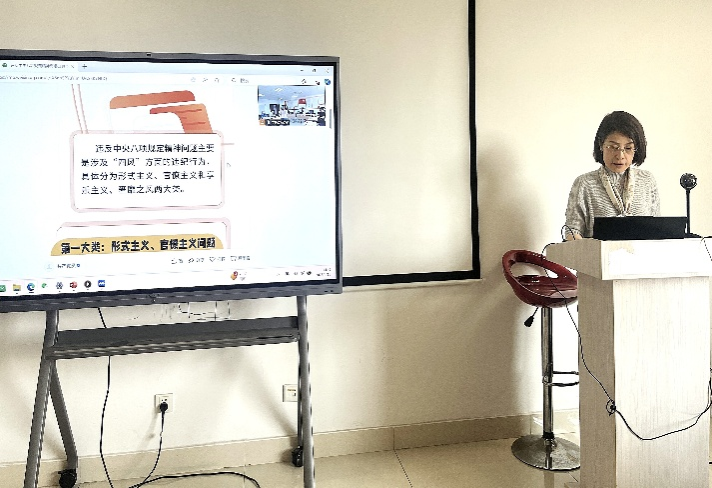 在学习环节,张燕咏领学了中央八项规定及其实施细则。她指出,违反中央八项规定精神主要涉及“四风”方面的违纪行为。她同时梳理了违反中央八项规定精神的具体表现形式,帮助党员以及领导干部更好地理解和遵守相关规定。