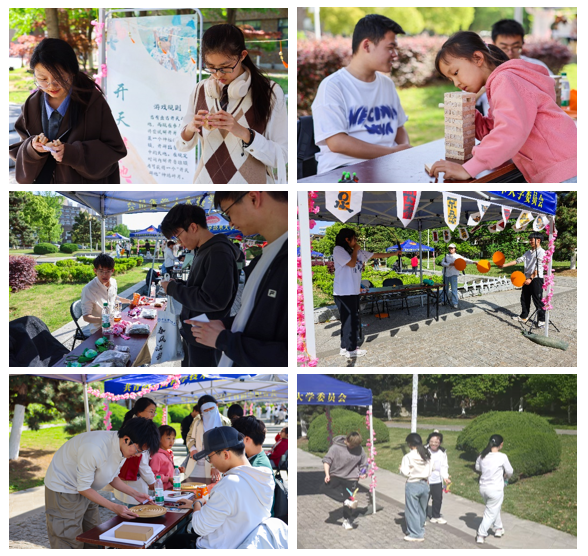 自东门信步而至,樱花坡上早已热闹非凡。志愿者们穿梭于蓝色棚帐间,将神话传说化为可触可感的体验,每个摊位都是精心设计的文化密码:“开天辟地”摊位上,榫卯交错的鲁班锁暗藏先民智慧;“神农尝百草”展台前,草药香囊引来阵阵惊叹;“后羿射日”体验区,木箭破空之声与欢笑声相和;“哪吒闹海”展示区,飞扬的羽毛毽子是青春的最好写照。