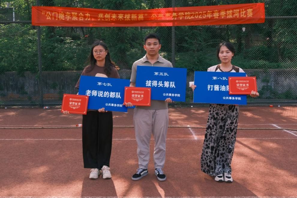 春风拂动绿茵场,青春拼搏正当时。为丰富学生课余生活,增强学院与班级凝聚力,激发青年学子团结奋进的精神力量。4月20日下午,公共事务学院2025年“公门桃李聚合力 共创未来拔新篇”春季拔河比赛在西校区田径场成功举办。比赛由夏登月同学主持,吴达、朱谊两位同学担任裁判,学院研究生会负责组织。