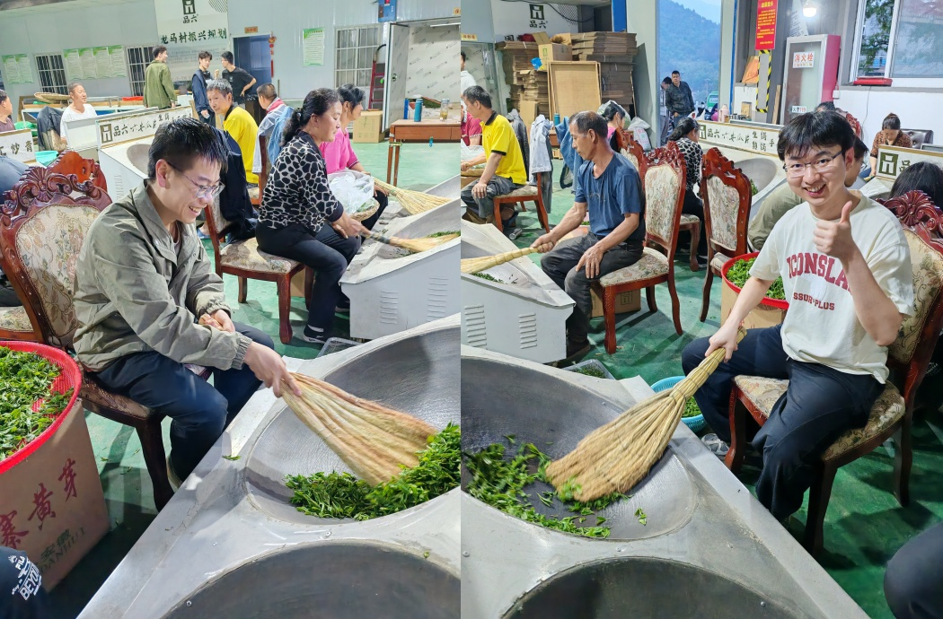 4月19日,社会实践团首站调研龙马村高山茶产业发展。此时恰逢高山茶采摘季,同学们白天走进茶园,在茶农指导下现场学习鲜叶采摘技巧,晚上深入学校援建的茶厂,在炒茶师傅手把手指导下学习炒茶制茶工艺,在机器的轰鸣声中感受内山茶的独特魅力。经过采摘和炒制工艺的学习,同学们将自己采摘和炒制的茶叶分装打包,作为礼物带给亲友,沉浸式体验到劳动实践的乐趣与成果。当天,同学们从村部出发,循路而上参观学校天文学系支持建设的15米射电望远镜龙马天文台站,并在基本建成的望远镜前打卡留念,深刻感怀科技赋能乡村振兴带来的巨大变化,对高校服务社会使命有了直观的感受和认识。