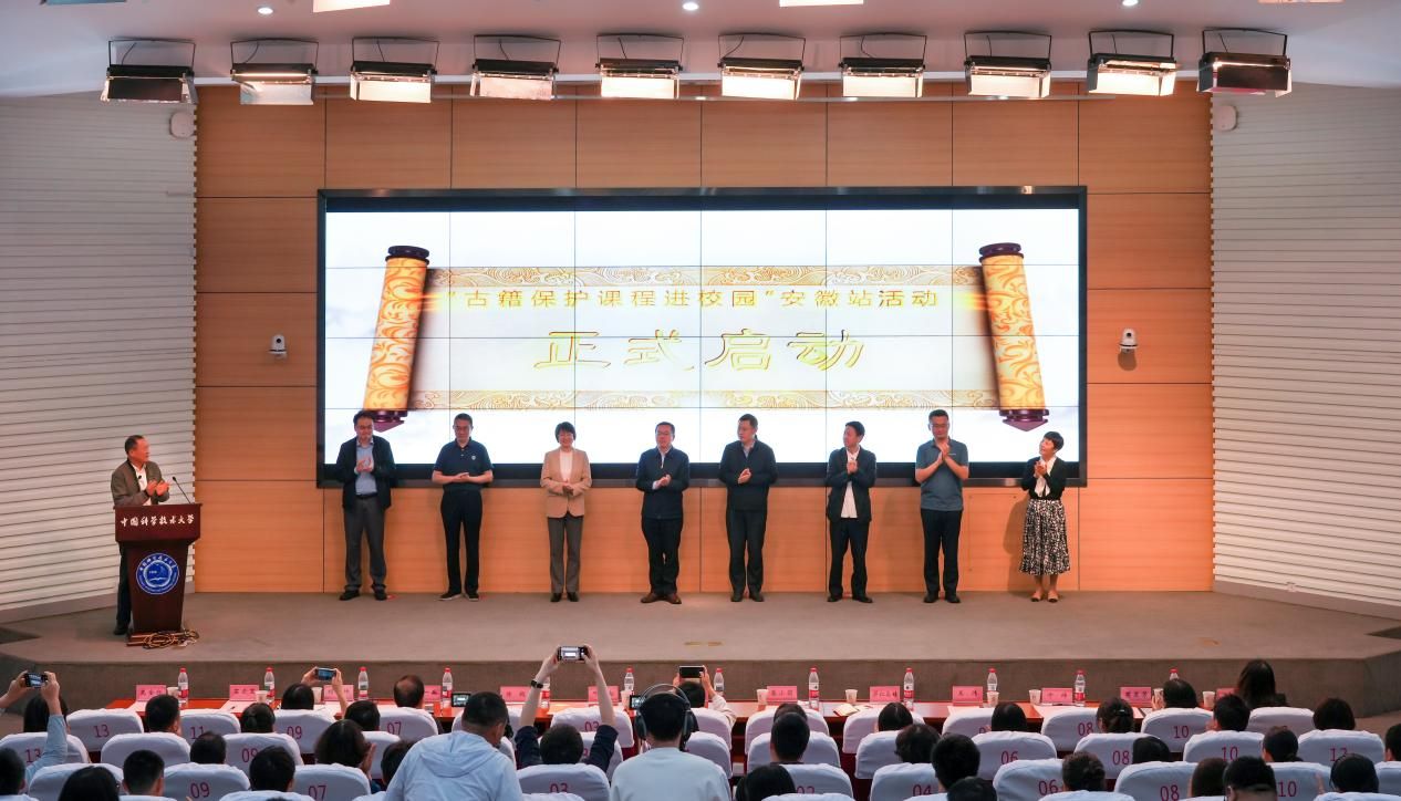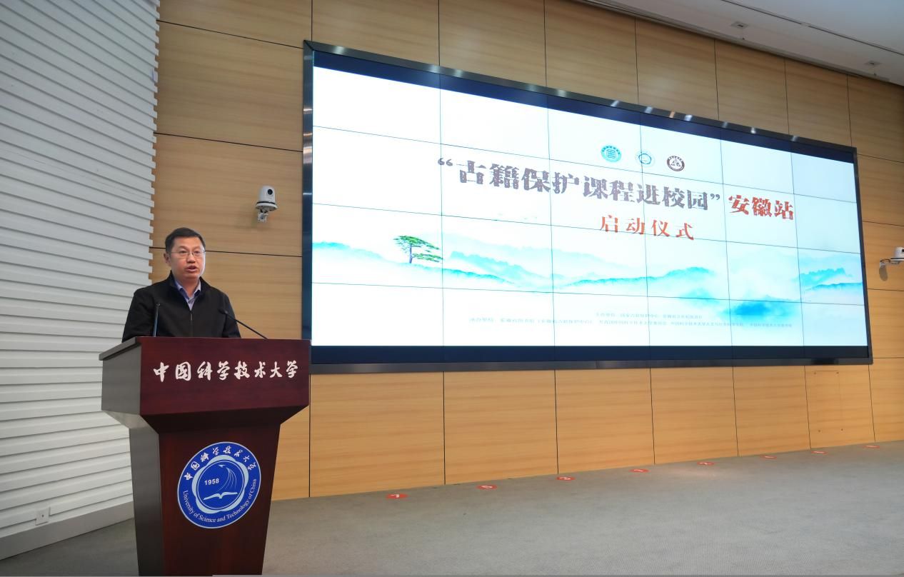 4月25日,由国家图书馆(国家古籍保护中心)与安徽省文化和旅游厅主办,安徽省图书馆(安徽省古籍保护中心)、中国科学技术大学团委、中国科学技术大学人文与社会科学学院、中国科学技术大学图书馆共同承办的“古籍保护课程进校园”安徽站首场活动在中国科大东区拉开帷幕,活动主题是“科技赋能‘保存、保护、传播、传承’”。国家图书馆副馆长魏崇,中国科学技术大学党委常委、副校长邓建松,安徽省文化和旅游厅党组成员蔡小莉,国家古籍保护中心办公室副主任萨仁高娃等领导与嘉宾出席启动仪式。仪式由安徽省图书馆馆长林旭东主持。