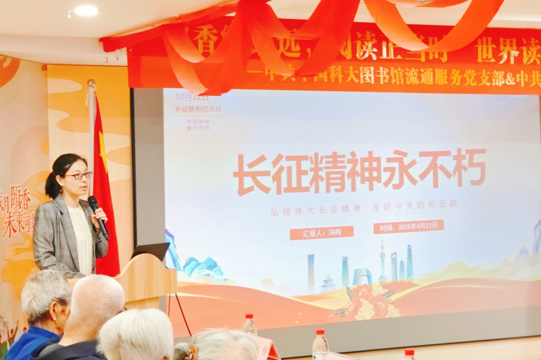 在党课分享环节,冯梅同志以《长征精神永不朽》为主题,深入阐述了红军长征的精神内涵和科学意义。她指出,长征精神所蕴含的“坚定信仰、团结奋斗、自强不息”的特质,与新时代党员肩负的使命高度契合;新时代党员要不忘初心,铭记长征精神内涵和意义,在新时代长征路上加强党风廉政建设,为党和国家事业的蓬勃发展筑牢坚实的纪律防线,为建设有中国特色的社会主义事业贡献力量。图书馆流通服务党支部党员代表陈俊好结合阅读《长征日记》的深刻体会,分享了红色经典对个人思想淬炼产生的深远影响,并呼吁青年党员“在新时代的长征路上勇毅前行、破浪奋进”。