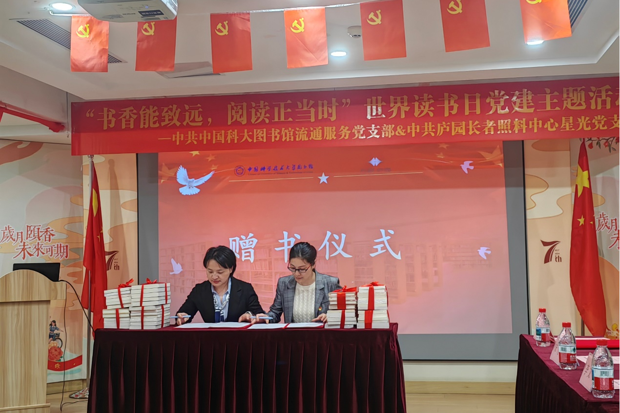 在赠图书环节,图书馆流通服务党支部向庐园长者照料中心星光党支部捐赠了40余册精心挑选的红色书籍,这些书籍涵盖党史党建、人物传记等多个类别。随后,双方代表庄重地签订结对共建协议。捐赠书籍与结对共建,不仅是知识的传递,更是对“尊老敬老”这一中华传统美德的生动践行,与庐园“医养结合、文化养老”的服务理念高度契合。