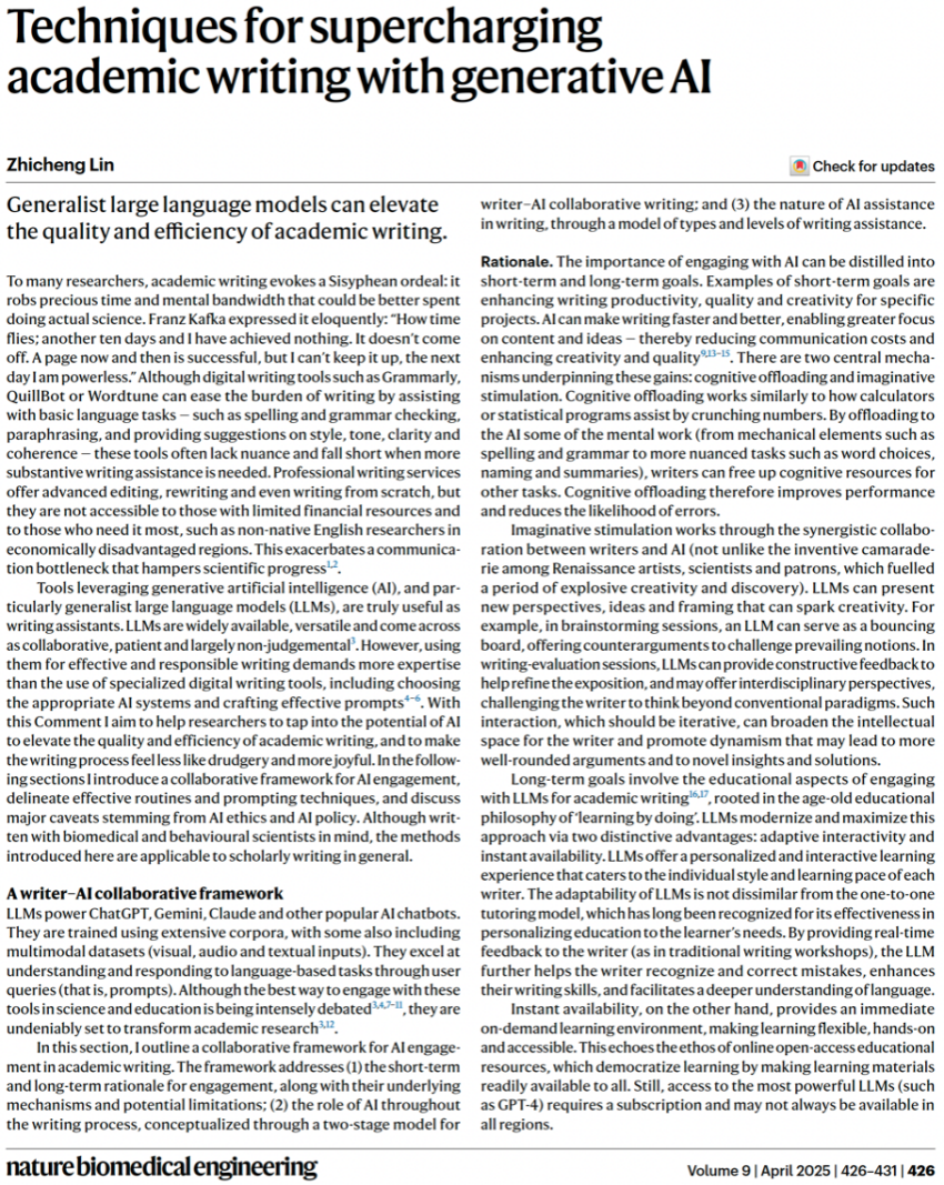 随着生成式人工智能技术的迅猛发展,如何将其应用于学术写作领域以提高效率和质量,成为全球研究者关注的焦点。近日,中国科学技术大学心理学系特任研究员林志成在国际期刊Nature Biomedical Engineering (《自然生物医学工程》)发表评论文章,提出一套基于大语言模型(LLM)的全新AI写作框架。此框架能帮助研究人员克服语言障碍,提升学术写作效率与质量,提高科研成果传播效率。