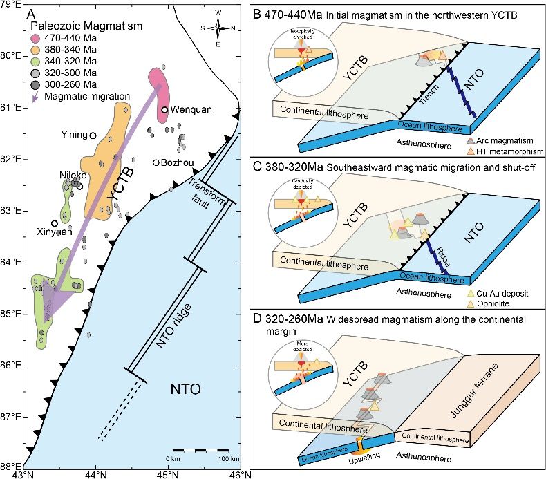 尽管俯冲上盘和下盘均可影响弧岩浆的形成和演化,但是西北天山古生代弧岩浆活动与蛇绿岩在时空分布上同步变化,表明弧岩浆作用与蛇绿岩侵位具有成因联系,因此俯冲板块的行为是控制弧岩浆演化的主导因素。此外,传统的机制,如海沟前进/后退、俯冲角度与汇聚速率改变、板片断离及岩石圈拆沉,都难以解释平行于海沟的岩浆活动转移和同位素组成的逐渐亏损。综合各项地质证据表明,洋脊-转换断层交错俯冲引起的板片窗最有可能解释这些特征(图2)。当北天山洋的洋中脊与伊犁-中天山板块北缘以小角度交汇,板片窗间歇性打开,促使岩浆弧从西北向东南方向逐渐转移并造成周期性岩浆作用 (图1和2A-C),同时伴随高温变质作用,富Nb玄武岩-高镁安山岩-埃达克岩组合、Cu-Au矿床和A型花岗岩的形成。当北天山洋闭合,洋脊俯冲到大陆之下,最终在大陆边缘产生广泛的岩浆作用(图2D)。此外,板片窗的打开导致亏损的软流圈地幔物质上涌,造成Nd-Hf同位素系统性亏损。因此,洋脊-转换断层交错俯冲不仅控制了弧岩浆活动的时空分布和地球化学特征,同时也塑造了古俯冲带独特的构造演化格局。
