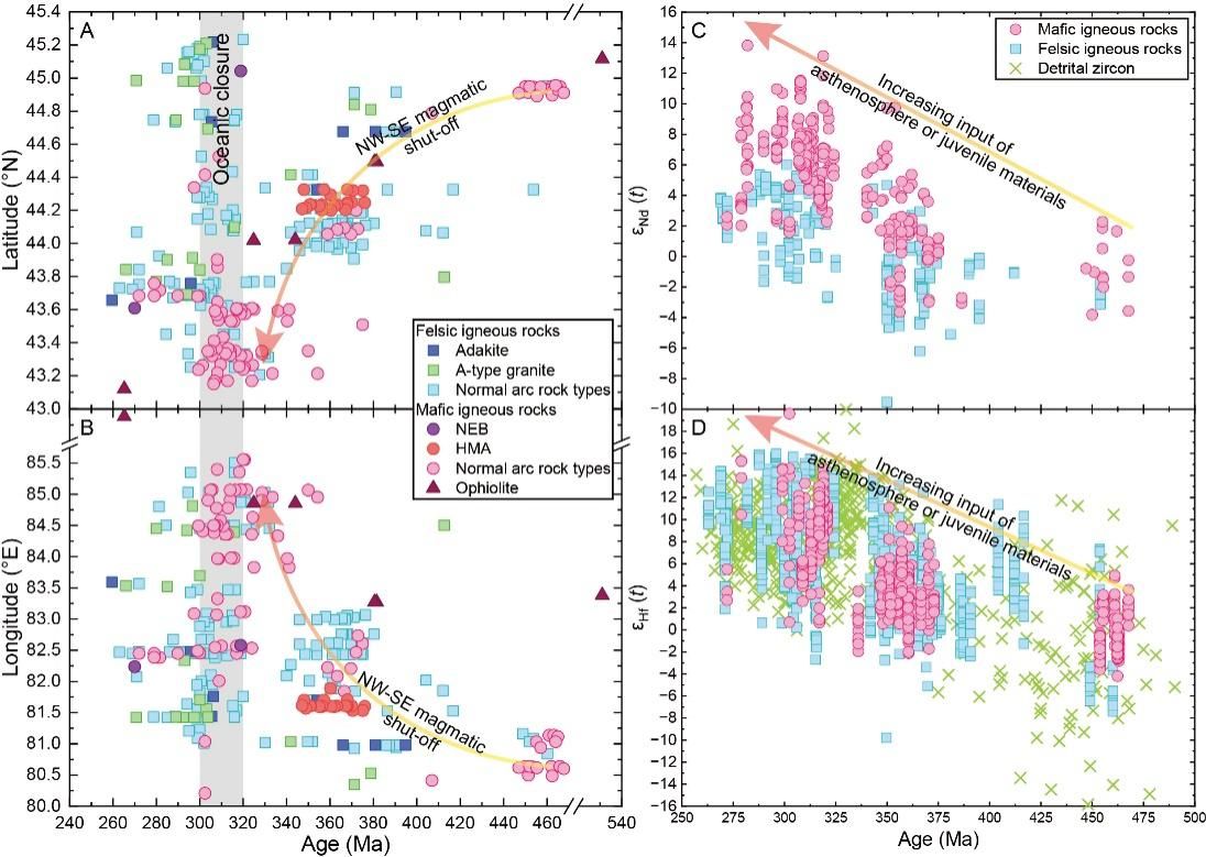 中国科学技术大学地球和空间科学学院、岩石圈演化和环境演变全国重点实验室郑永飞院士研究团队戴立群教授研究组以中国西北天山为研究靶区,系统梳理了该区域的古生代火成岩、蛇绿岩和碎屑锆石的空间分布、年代学与地球化学数据。结果显示,古生代岩浆活动存在明显的时空演化规律,岩浆岩与碎屑锆石随时间演化均显示逐渐亏损Nd-Hf同位素特征(图1),并伴随有同时期富Nb玄武岩-高镁安山岩-埃达克岩组合以及Cu-Au矿床的形成,指示了洋脊-转换断层交错俯冲导致的板片窗间歇性打开对弧岩浆的控制作用。相关研究成果以“Magmatic record reveals an ancient slab window linked to paleo-oceanic subduction”为题,5月23日发表在Nature Index收录的国际地质学知名期刊《Geology》上。