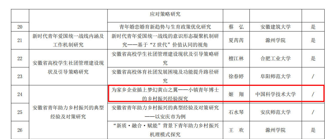 入选课题包括:蒋文娟《高校共青团推优入党量化指标体系的创新构建与实践研究》、朱东杰《青年科技创新创业培训体系构建》、蔡文静《产教融合新范式:安徽产业特色导向下大学生就业能力培育模式》、姬翔《为家乡企业插上梦幻黄山之翼——小镇青年博士的乡村振兴经验探究》。