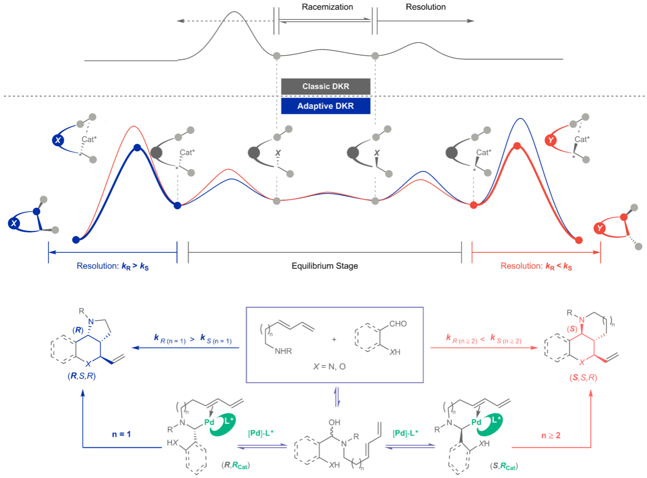 中国科学技术大学黄汉民教授团队原创性地提出了一种“自适应动态动力学拆分”(Adaptive DKR)新概念,实现了应用同一手性催化剂,在构建不同尺寸的环系过程中,产物手性中心的绝对构型随环尺寸“动态适应”性反转。这一颠覆传统认知的手性构建新概念为高效构建含多个立体中心的结构多样的氮杂多环化合物库提供了强大的合成方法学工具,并在应用于天然药物分子Martinellic acid全合成中取得显著突破(LLS短至9步、大于11%收率)。相关研究成果以“Adaptive dynamic kinetic resolution enables alteration of chiral induction with ring sizes”为题于6月23日发表在国际知名学术期刊《自然·化学》上。