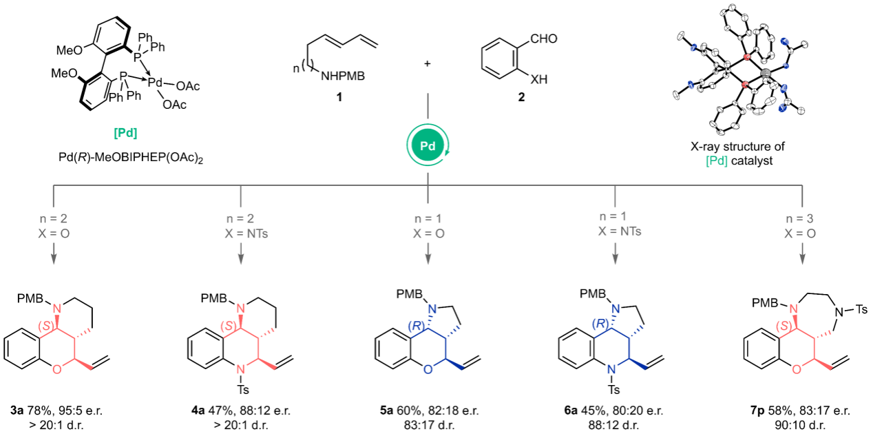 基于这一创新机制,团队发展了一套高效的钯催化不对称环化反应(图2)。使用完全相同的手性双膦配体螯合的钯催化剂,当改变胺基二烯链长度(即改变目标产物的环尺寸)时,产物分子中氮原子邻位手性中心构型发生了反转,合成六元环和七元环的氮杂并环产物时,主要立体异构体氮原子邻位手性中心呈S构型;而合成五元环产物时,该位置则“自适应”地反转为R构型。该反应底物普适性优异,能够兼容多种水杨醛、邻氨基芳香醛、胺烷基醛及胺基二烯底物,以良好的收率、非对映选择性和对映选择性构建含有多个连续手性中心的结构多样([6,6,6], [6,6,7], [6,6,5]等稠合模式)的氮杂多环化合物。