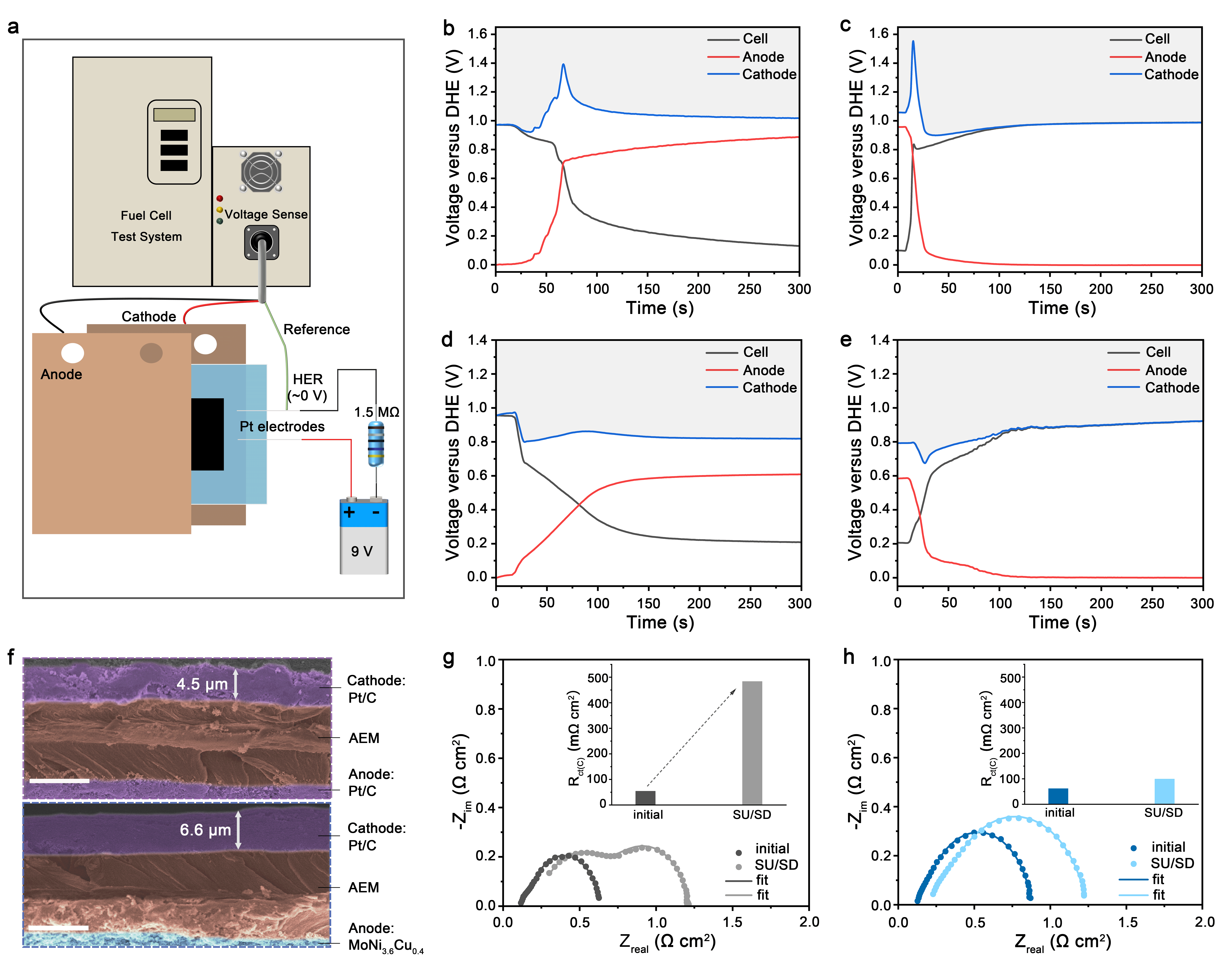 研究团队通过微波加热和后续热处理成功制备了MoNi3.6Cu0.4催化剂,并将其用作AEMFC阳极催化剂的膜电极组件进行模拟启停循环测试。结果显示,相比传统的Pt/C阳极,使用该催化剂的电池在启停过程中阴极电位跃迁从1.4 V大幅降低至安全范围(图2)。经过10次启停循环后,阴极催化剂层厚度几乎保持不变,阴极电荷转移阻抗的增幅也远低于Pt/C,峰值功率密度保持率达61%,显著优于Pt/C(28%)和未掺杂钼镍合金(47%),阴极腐蚀现象近乎消失。