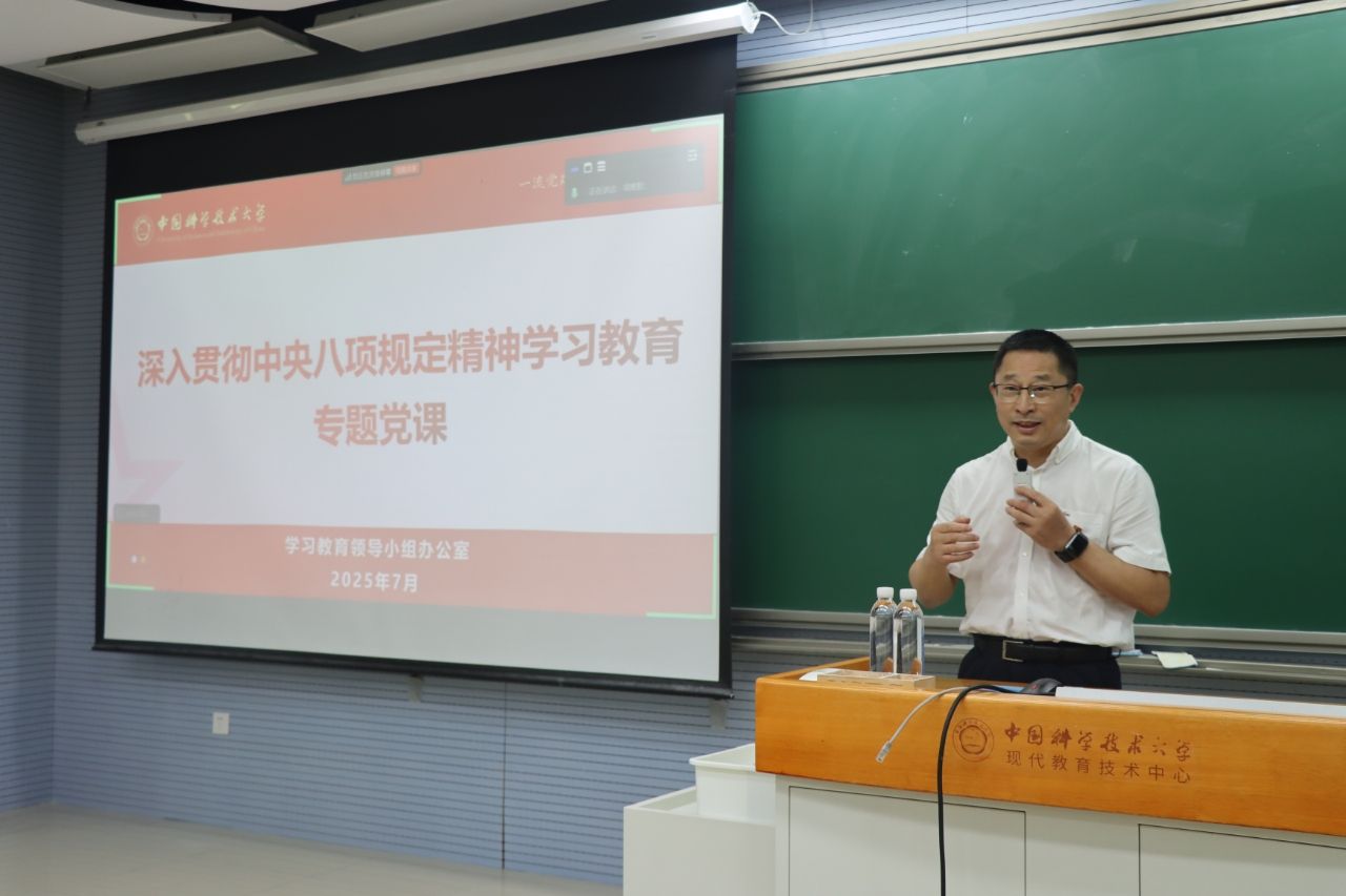 7月2日下午,校党委副书记周丛照以《深入贯彻中央八项规定精神学习教育》为题,为分管(代管)部门及联系单位党员讲授专题党课。党政办公室、高新园区建设与管理委员会办公室、机关党委办公室、党委宣传部、党委学生工作部(处)、团委、工会、图书馆、网络信息中心、档案文博院、国际合作与交流部、公共实验中心及核科学技术学院辐射防护与环境保护教研室研究生党支部党员参加学习。党课由党政办公室主任叶征主持。