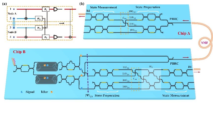 构建大规模量子网络的关键在于实现高集成度、可扩展的量子节点,以及节点间高保真度的量子互联。光量子集成芯片是实现此网络极具前景的平台。在此网络中,不同节点量子比特间的量子门操作至关重要,而最具挑战性的便是实现高保真的CNOT门隐形传输以纠缠远程量子比特,这是分布式量子计算的核心步骤。其实现过程极为复杂:需在两个量子节点间共享纠缠光子对,并在每个节点内执行高精度、复杂的片上线性光学量子操作,对器件性能要求极高。