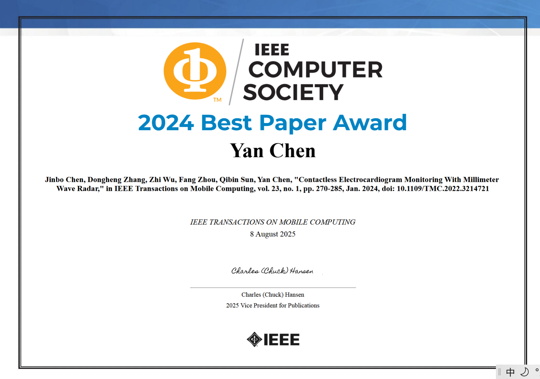 近日,国际电气与电子工程师协会(IEEE)旗下 IEEE 计算机学会(IEEE Computer Society)公布其年度最佳论文名单。中国科学技术大学网络空间安全学院陈彦教授团队的研究论文“Contactless Electrocardiogram Monitoring with Millimeter Wave Radar”脱颖而出,荣获移动计算知名期刊IEEE Transactions on Mobile Computing(IEEE TMC)2024年度唯一最佳论文(Best Paper Award)。