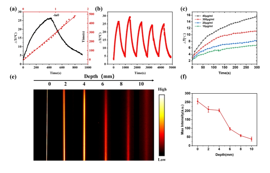 图2.纳米粒子光热性能及穿透深度表征