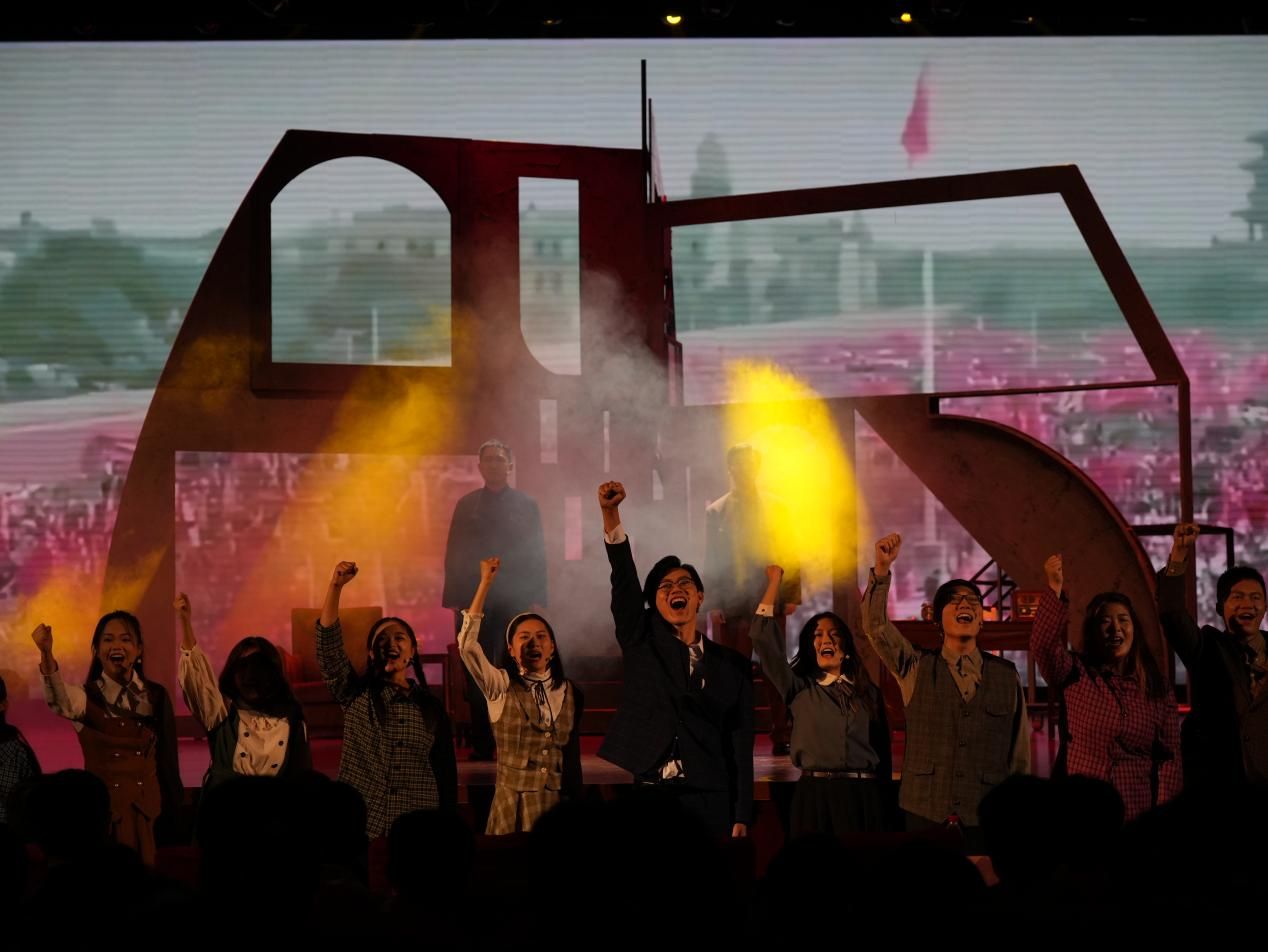 台下,观众的情绪随着剧情跌宕起伏。开场时,富有年代感的舞台布景及妆造将人们瞬间拉回那个落后与追求同在的年代;当再现赵忠尧突破重重阻挠最终回到祖国的怀抱,众人高呼“祖国万岁、科学万岁”时,观众们跟着热血沸腾。话剧的最后一幕,当赵忠尧与另一个自己回顾新中国研发原子弹的种种不易时,观众们又眼含热泪。谢幕时刻,全体演员手持鲜花向观众致意,炽热的青春热血与深沉的历史敬畏在此交融。