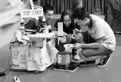 9月27日,中国科学技术大学机器人大赛在学生活动中心举行,21支学生队伍参加 “厨师机器人大赛”,15支学生队伍参加“助残机器人大赛”。科大学子发挥想象力,用普通材料制作出机器人,观看比赛的市民啧啧称奇。 本报记者 徐旻昊 杨竹 摄