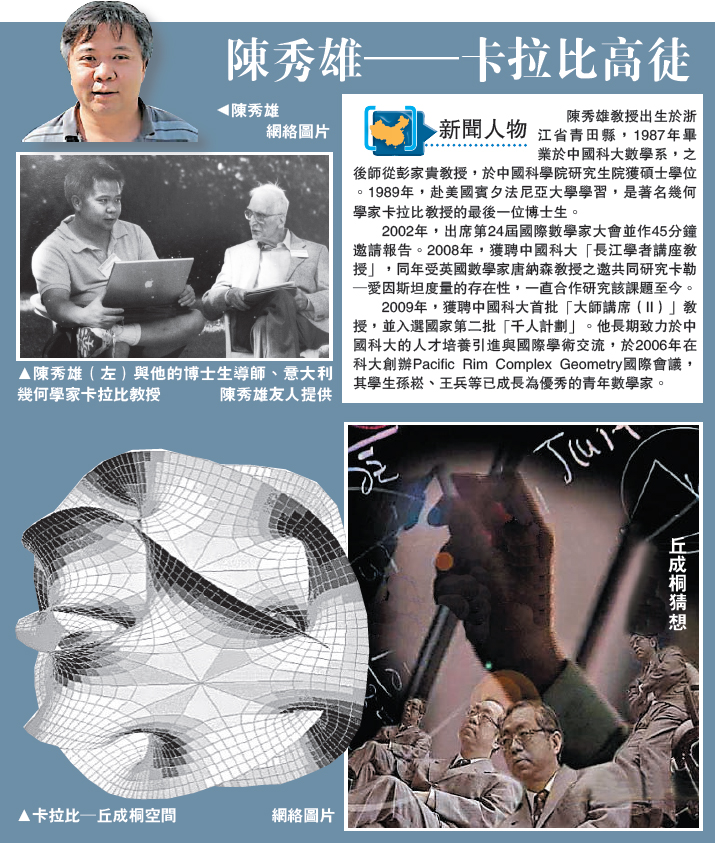 中國科學技術大學今日稱,該校教授陳秀雄與英國數學家、菲爾茲獎得主唐納森以及科大校友孫崧博士合作,最近在幾何分析領域取得重大突破,成功破解了卡勒─愛因斯坦度量的存在性之丘成桐猜想。【大公報記者柏永、通訊員範瓊合肥十四日電】