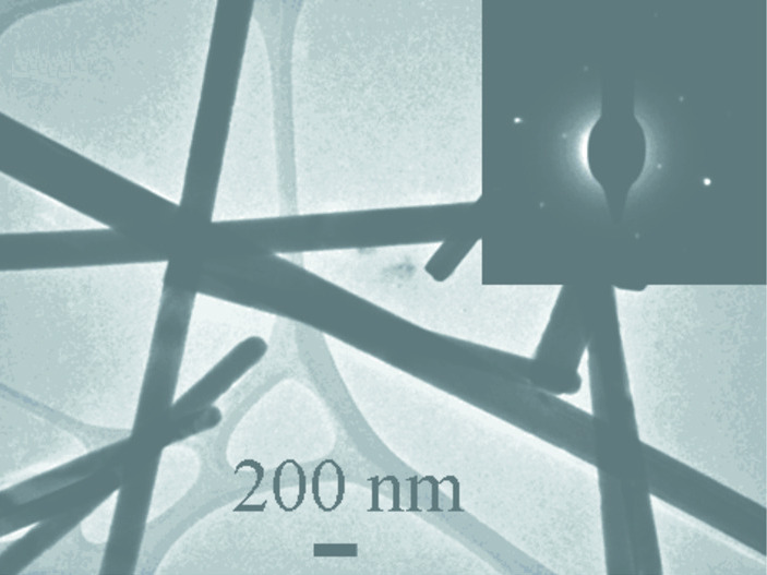 This is a typical TEM image of as-prepared GeS nanowires with the inset showing a selected area electron diffraction pattern taken from GeS nanowires. Credit: Liang Shi and Yumei Dai |