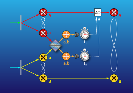 Figure 1 To entangle independent photons of different color, researchers use down-conversion to generate two pairs of polarization-entangled photons, labeled (A, a) and (B, b). The frequencies of each pair differ by either 40 or 80 MHz. Photons a and b enter a beam splitter, resulting in a “hypoentangled” state of polarization and frequency. Two detectors record the arrival times, t1 and t2, of the two photons, and this information is fed forward to a device that applies a time-dependent phase shift to photon A. In the end, the entanglement of a and bis swapped to A and B. |