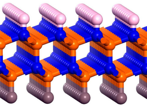 Illustration of the boron-nitride bilayer (blue and orange atoms) functionalized with fluorine atoms along the bottom and hydrogen atoms long the top. (Courtesy: Jinlong Yang)