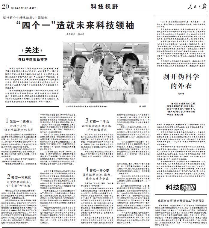 研究生是创新人才培养的重要一环,数量剧增、质量下降的现象引发社会的广泛关注。在此背景下,中国科大培养的研究生质量令人瞩目:过去5年来,该校研究生对全校SCI论文的贡献率达到62%,博士生在《科学》《自然》(含子刊)上发表论文20多篇,17篇论文获得全国百篇优秀博士论文,研究生与导师合作完成的重大成果数次入选“世界科技十大进展”、“国内十大科技进展”、“中国高校十大科技进展”……