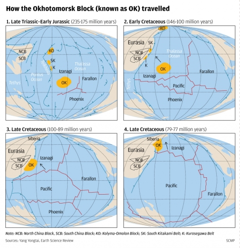 How the Okhotomorsk Block (known as OK) travelled. / Image from YANG Yongtai's group.