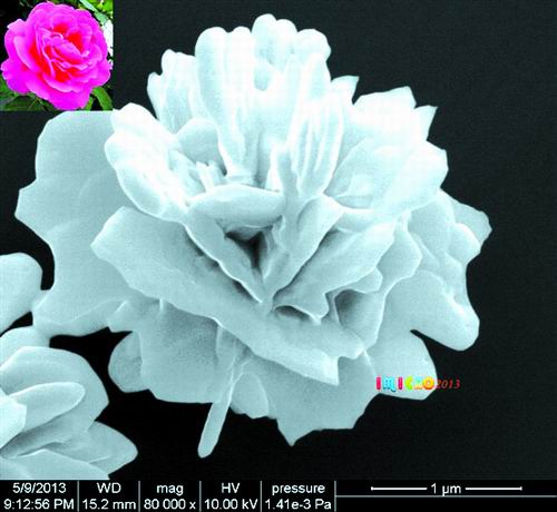 通过特殊的湿化学工艺而获得的具有纳米结构的仿月季花状的纯银晶体。