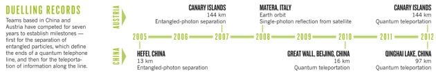 The work aroused Zeilinger's competitive instincts. “The Chinese were doing it, so we thought, why not try it?” he says with a laugh. “Some friendly competition is always good.” The race began to push the distance record farther and farther (see 'Duelling records'). Over the next seven years, through a series of experiments carried out in Hefei, then by the Great Wall in Beijing and finally in Qinghai, the Chinese team teleported over ever-greater distances, until it passed 97 kilometres5. The researchers announced their results in May, posting a paper on the physics preprint server, arXiv — much to the chagrin of the Austrian team, which was writing up the results of its own effort to teleport photons between two of the Canary Islands. The Austrian group posted its paper on arXiv eight days later, reporting a new distance record of 143 kilometres6. The papers were eventually published, in quick succession, in Nature5, 6. “I think that was in recognition of the fact that each experiment has different and complementary merits,” says Xiao-song Ma, a physicist at the University of Vienna and a member of the Austrian team.