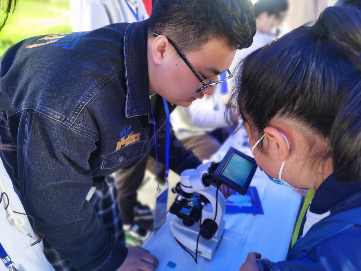 在东区计算小楼前的广场上,中国科大环境科学与工程科普点挤满了身穿各式校服的学生们。“魔法净水:一扇神奇的魔法门”“神奇生命在哪里:生态小卫士”“为水画一张‘脸谱’”……中科大的学生志愿者们耐心地给同学们讲解科普原理、演示科学实验。前来参观的学生们纷纷动手体验,感受环境科学的美妙。