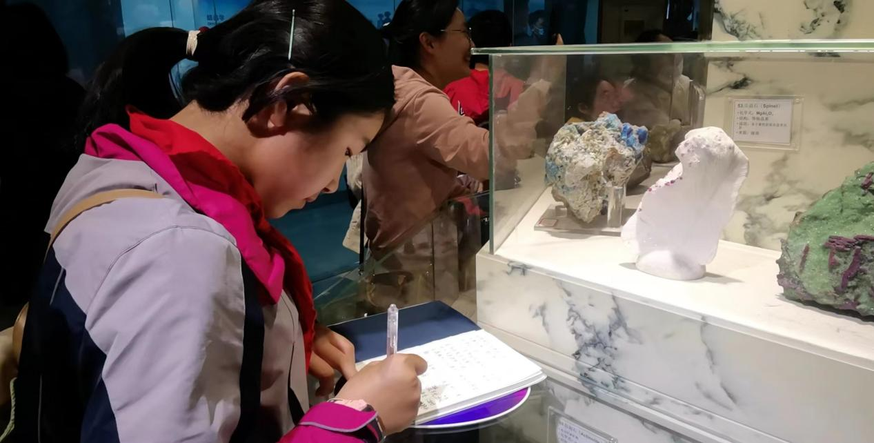 来自合肥高新创新实验小学的五年级学生崔艺萌手拿着纸笔,边仔细观察眼前雪白的尖晶石,边认真地记着笔记,沉浸在神秘的矿物世界。