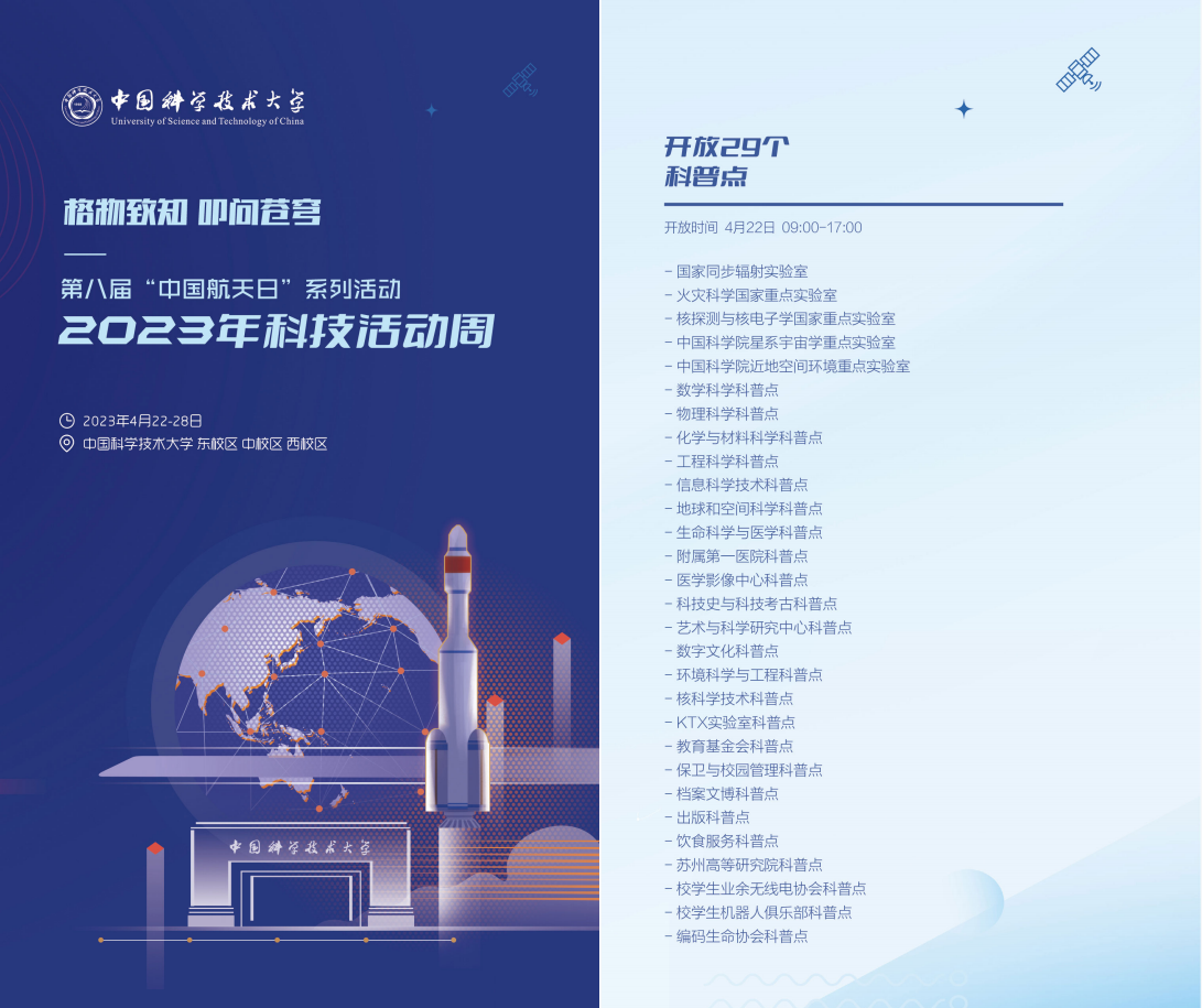 4月22日,中国科学技术大学2023年科技活动周拉开帷幕。作为第八届“中国航天日”系列活动之一,本届科技活动周以“格物致知 叩问苍穹”为主题,分别在学校的东、西、中校区举办了多种多样的科普活动,为青少年奉上科学盛宴。