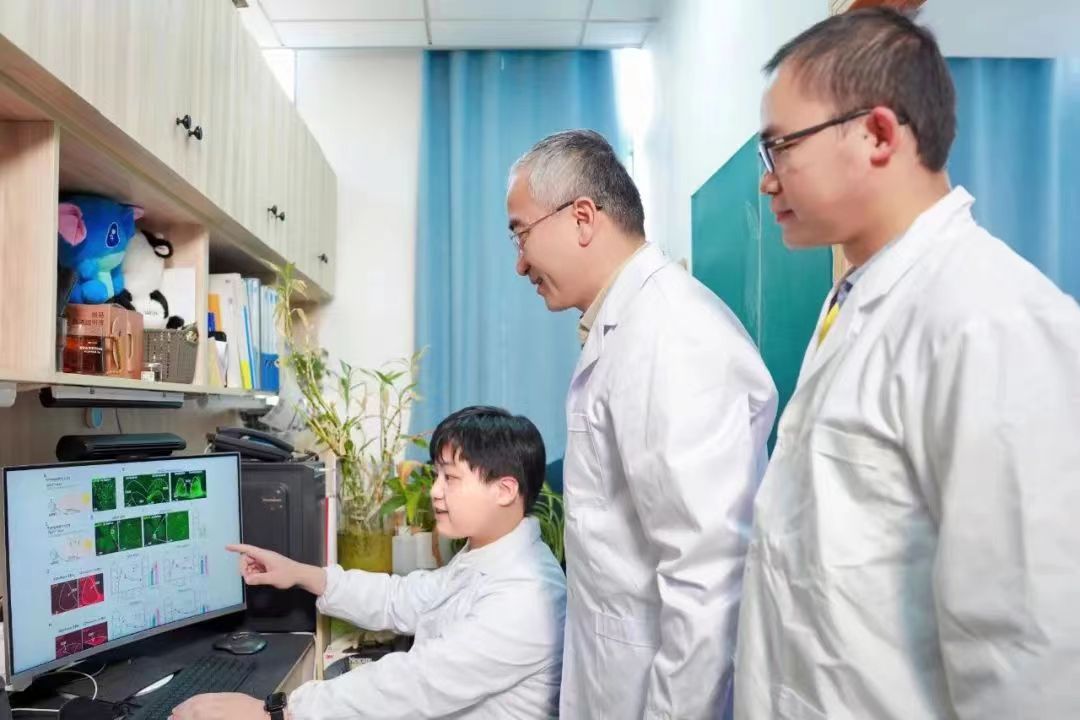 生命科学学院薛天教授(中)指导学生分析实验数据。 周欣宇 摄