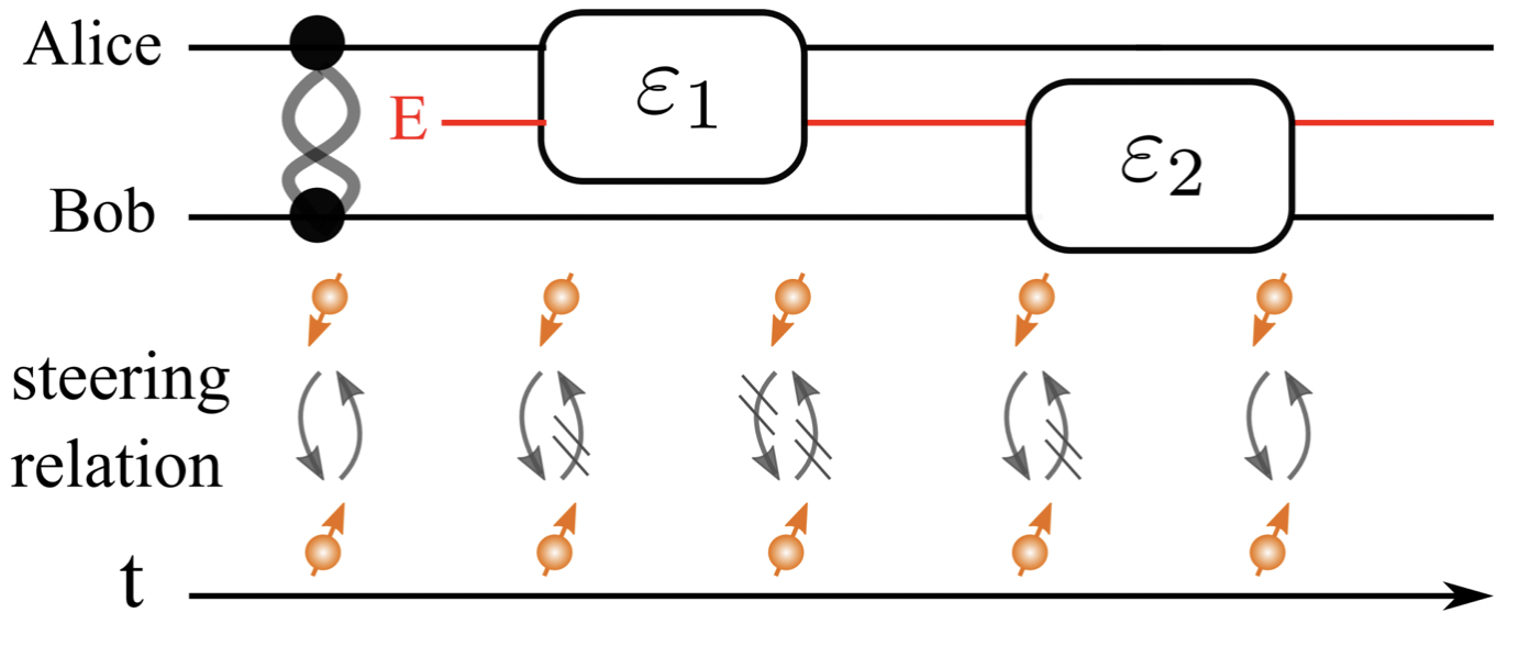 在前期工作基础上,研究组实验制备了两种不同非马尔可夫度的环境,首先研究了量子导引在耗散环境中的动力学演化,通过调节在耗散环境中的演化时间实现了多测量方向下系统状态从最初的双向导引到单向导引,以及不可导引的耗散过程。研究组进一步实现了在较高非马尔可夫度环境中的量子导引恢复,验证了越高非马尔可夫度的环境对应的记忆效应越强,对量子导引的恢复能力也越强。另外,研究组还通过观测到可导引量子态逐渐演化为具有纠缠但不可导引的量子态,证实了量子纠缠和量子导引之间的层级关系。