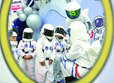 在山东沂南县举办的中国航天日主题科普活动上,孩子们在体验“宇航服”。新华社发