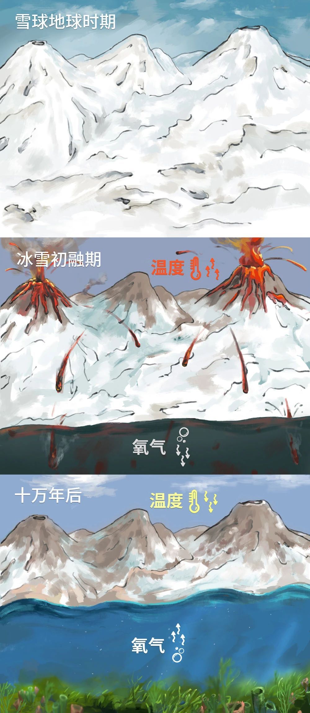 雪球地球时期前后环境与生命演化示意图。(杨定华、刘旭峰绘图)