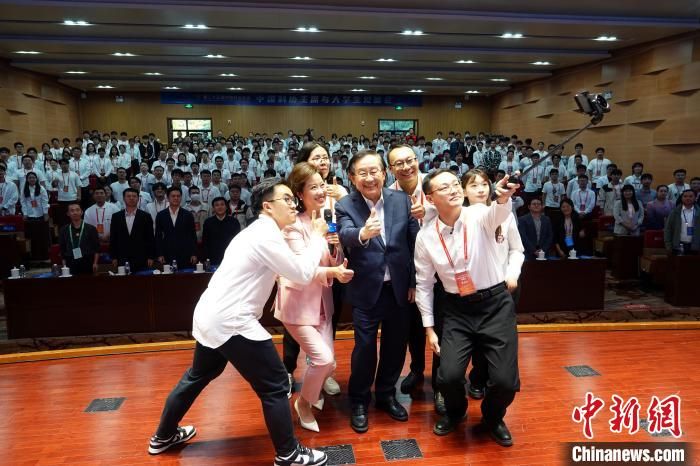 中国科协主席万钢与大学生代表对话交流结束后合影。中新网记者 孙自法 摄