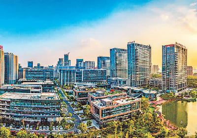 与安徽省合肥市城区连在一起,远远地,科大硅谷已拓展至西部丘陵地带。碧波荡漾,绿地连绵,从蜀西湖北岸极目望去,能看到大蜀山高耸的峰峦,还有合肥量子科学中心那H型设计的轮廓。