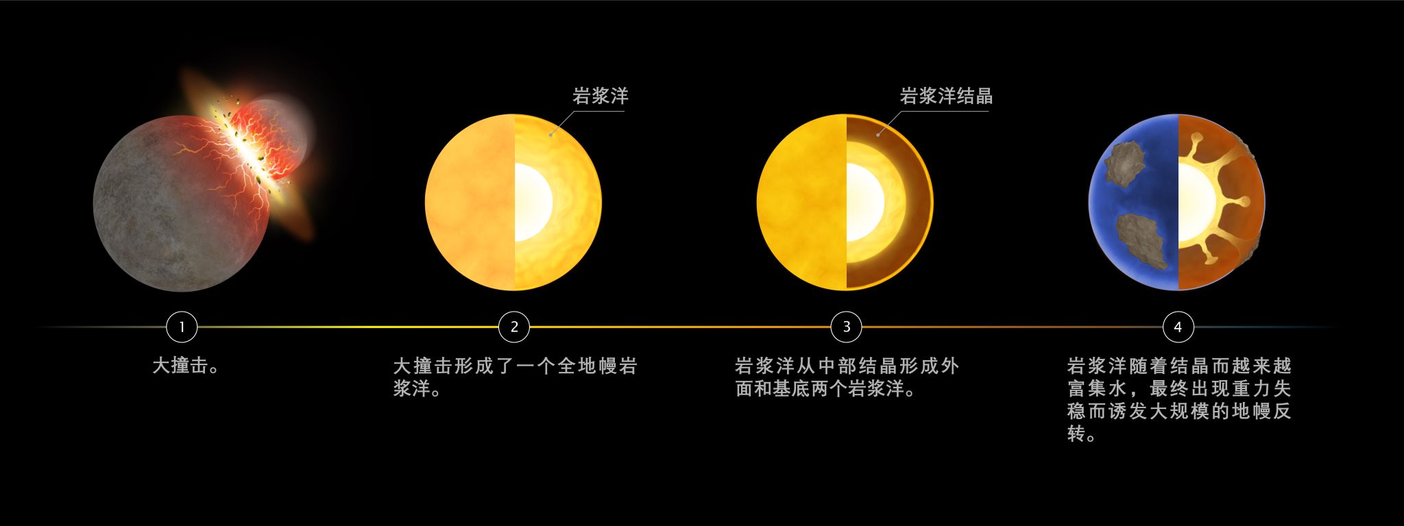 此次工作中,吴忠庆等人提出在形成月球的大撞击后,整个地幔熔化形成了岩浆洋,岩浆洋在中地幔深度结晶,形成外面和基底两个岩浆洋。由于下地幔矿物含水能力低,随着岩浆的结晶,基底岩浆洋将越来越富水,水降低了基底岩浆洋的密度,当水富集到一定程度后,岩浆洋的密度不再比上覆地幔高,基底岩浆洋会出现重力失稳而形成地幔反转,该反转将水带到地球浅部,促进大陆和克拉通地幔岩石圈等的形成。当地幔反转耗尽基底岩浆洋后,太古宙型的大陆不再产生,太古宙末期对应着大陆形成机制的转变期,水诱导的地幔反转可以自然地解释为什么太古宙前后的大陆有完全不同的特性。