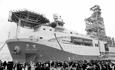 我国自主设计建造的首艘大洋钻探船——“梦想”号12月18日正式命名并在广州南沙首次试航。它总吨约33000吨,总长179.8米、型宽32.8米,续航力15000海里,自持力120天,稳性和结构强度按16级台风海况安全要求设计,具备全球海域无限航区作业能力和海域11000米的钻探能力,将为大洋能源资源勘查开采提供重要装备保障。